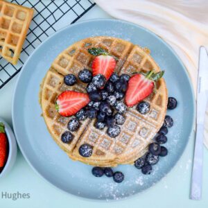 - Po upieczeniu:Wyjmij gofry i połóż je na kratce do studzenia.Podawaj na ciepłoMożesz serwować z ulubionymi dodatkami, np. świeżymi owocami, syropem klonowym lub jogurtem kokosowym