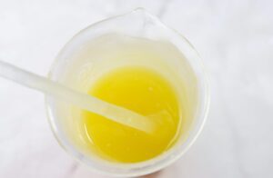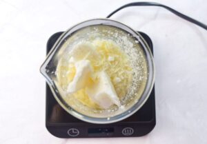 - Schładzanie i mieszanie – Po rozpuszczeniu składników wstaw masę do lodówki i co jakiś czas mieszaj, aż zacznie gęstnieć (powinna osiągnąć konsystencję przypominającą emulsję – tzw. “trace”). Dzięki temu masło będzie miało kremową konsystencję i łatwo się rozprowadzało na skórze.